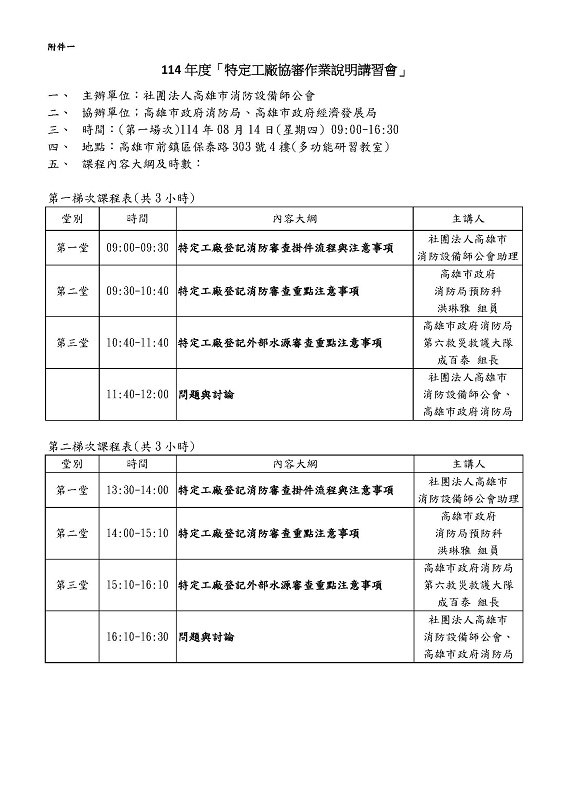 各位好:本會於114/8/14及114/8/22上午與下午辦理各1場特定工廠圖審說明會,共計4場,每場座位限制30人,議程表與報名表單如下,截止日至114年8月12日,謝謝。
