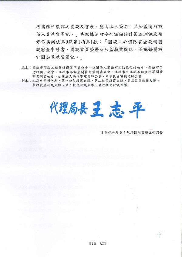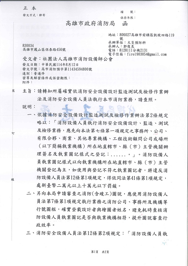 代消防局承辦轉達: 提醒協審人員注意消防圖說圖框顯示之消防公司應與簽證設備師同一執業機構,以提升圖說審查行政效率。