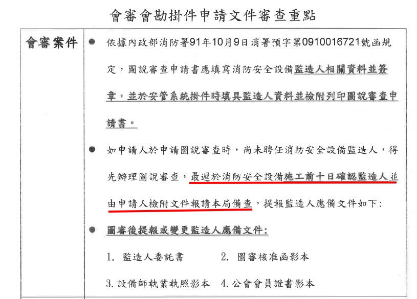 代消防局承辦轉達: 提醒~因特定工廠多屬既設設備,請公會受理特定工廠圖說審查案件時,請注意申請書監造人是否填寫,目前查核許多安管系統有登打監造人資料但紙本申請書未填寫監造人情形,如該場所尚無監造人,請申請人最遲於施工前10日確認監造人並檢附文件向本局備查。
